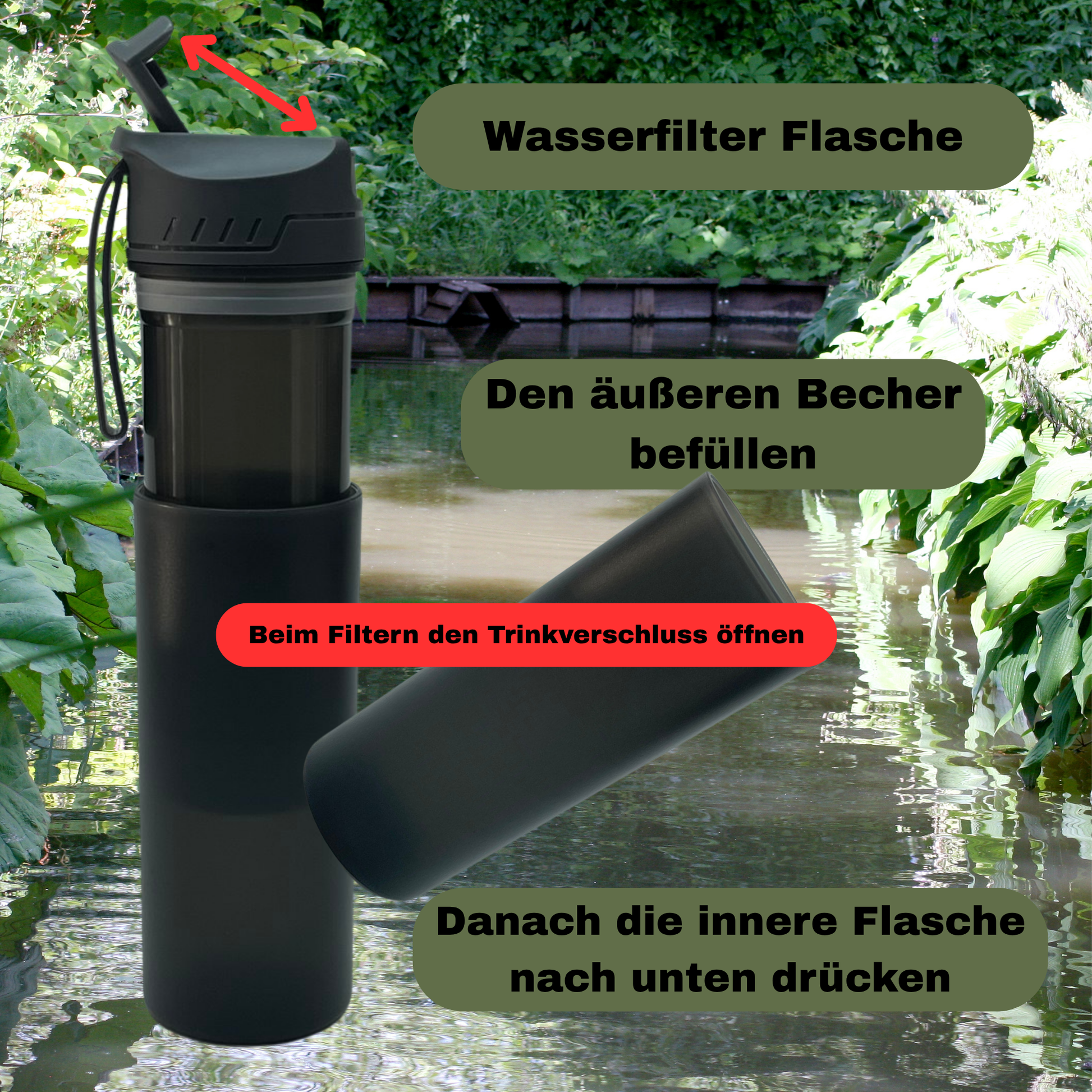Entdecken Sie die Outdoor Wasserfilter Flasche mit 650 ml Fassungsvermögen und einer beeindruckenden Filterkapazität von 1500 Litern. Ideal für Abenteuer und Reisen, sorgt sie zuverlässig für sauberes Trinkwasser direkt aus natürlichen Quellen. Leicht, praktisch und langlebig – Ihr perfekter Begleiter für sicheres Trinken unterwegs.